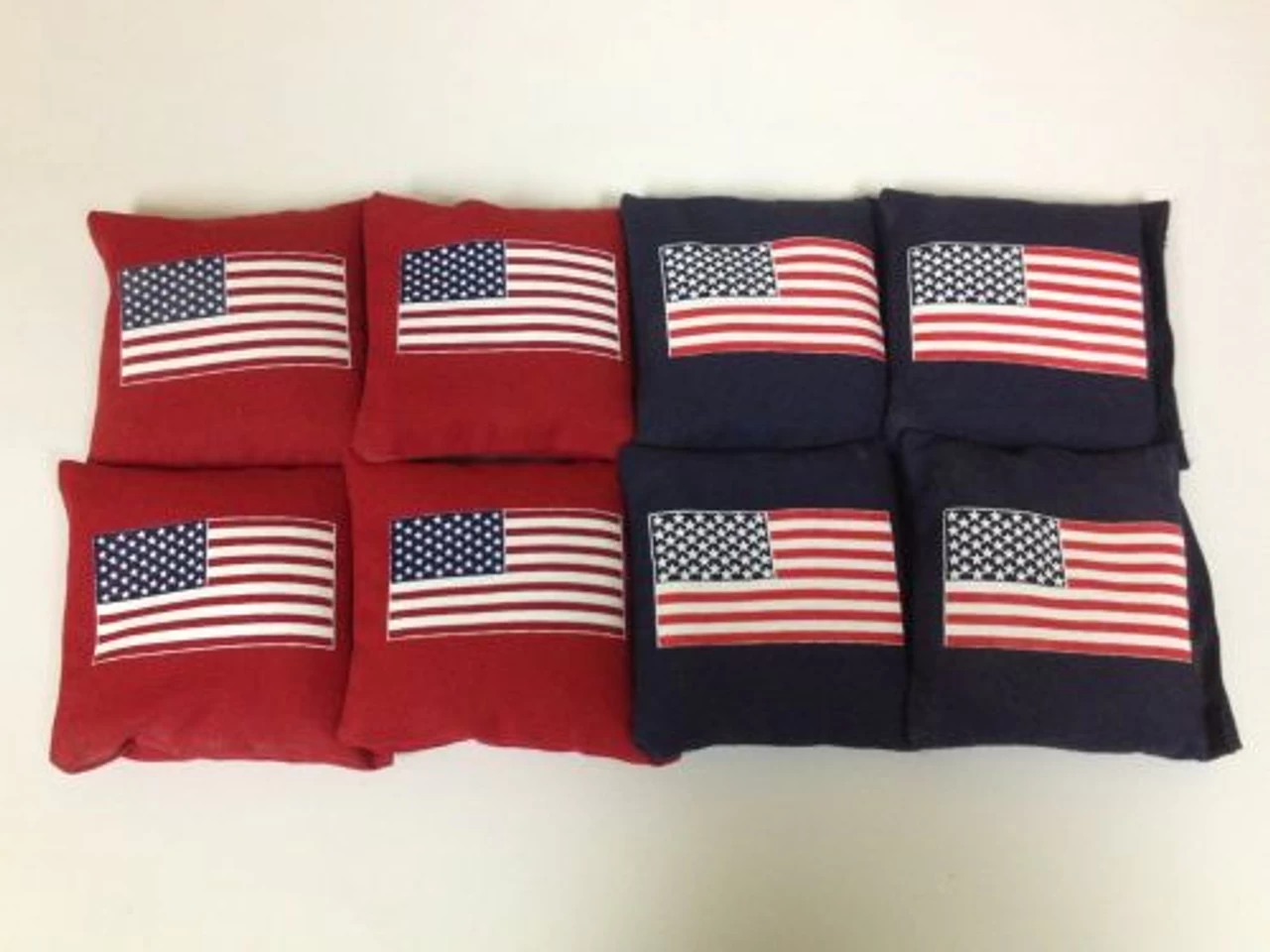 All of our cornhole bags are 6in x 6in and are filled with 16oz of whole kernel feed corn. The bags are constructed from 10oz Duck Cloth and are TRIPLE STITCHED for durability and strength.